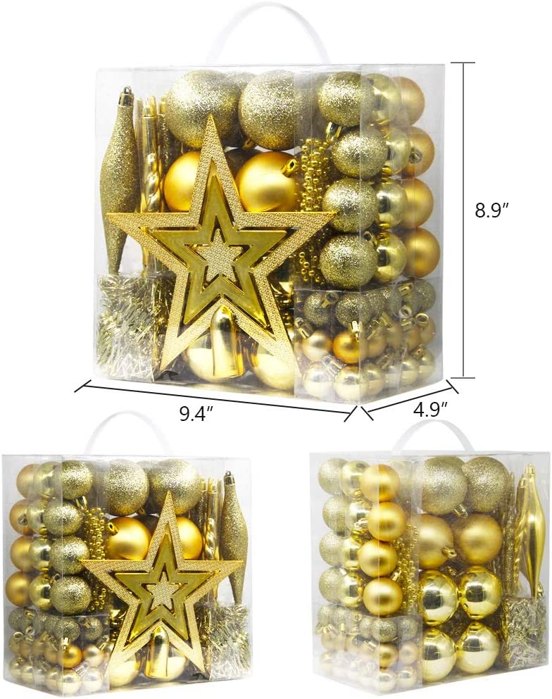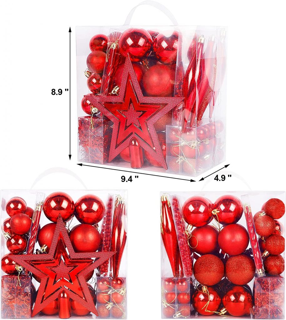 - ★75 Pieces Christmas Tree Ornaments★: Lulu Home Christmas tree ornaments set has diverse and beautiful Christmas tree ornaments with great quantity. Package includes 3-sized Christmas balls, shinny tree top star, red beaded chain, red tinsel garland, etc. The great quantity and sorts add a great festival touch to your Christmas tree.